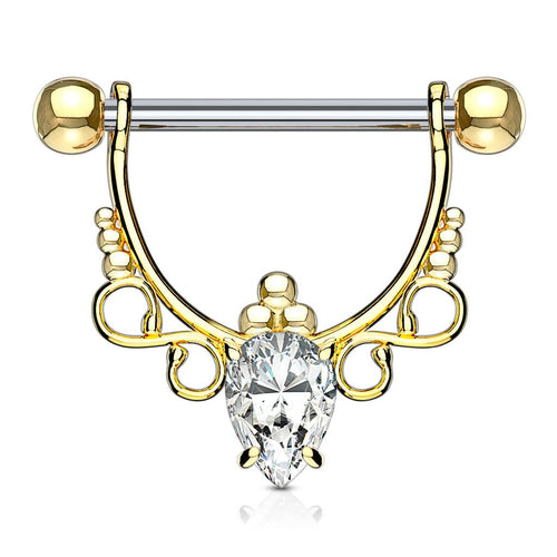 Gold IP Surgical Steel with White Pear CZ Dangle Nipple Ring Barbell