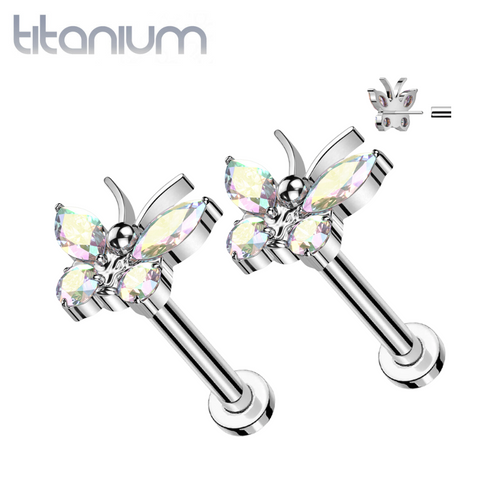 Pair of Implant Grade Titanium Aurora Borealis CZ Large Butterfly Threadless Push In Earrings With Flat Back