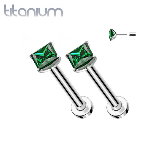 Pair of Implant Grade Titanium Threadless Square Emerald Green CZ Gem Earring Studs with Flat Back