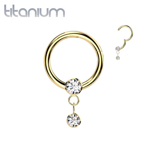 Implant Grade Titanium Gold PVD White CZ Bezel Dangle Hinged Clicker Hoop