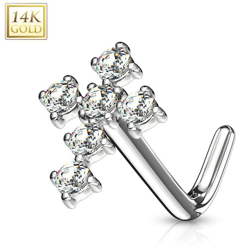14KT Solid Yellow Gold L Shape Bent All White CZ Cluster Nose Stud