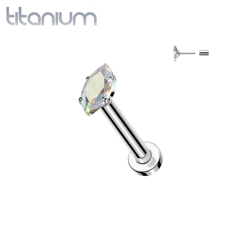 Implant Grade Titanium Aurora Borealis CZ Clawed Marquise Gem Push In Threadless Labret With Flat Back