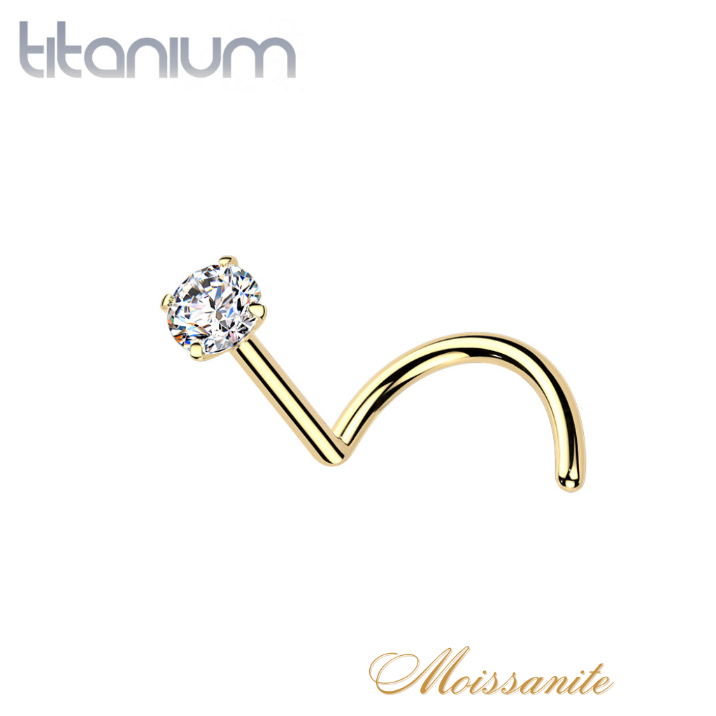 Implant Grade Titanium Gold PVD White CZ Moissanite Corkscrew Nose Ring - Pierced Universe