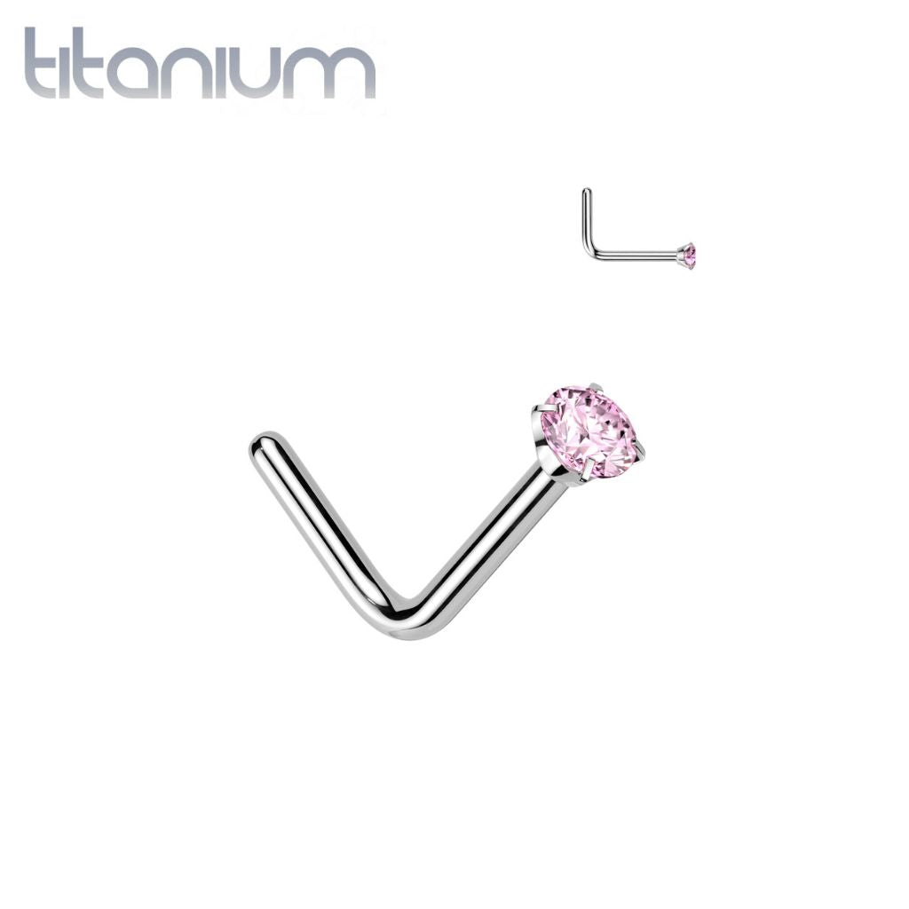 Implant Grade Titanium Pink CZ L Shape Nose Stud - Pierced Universe
