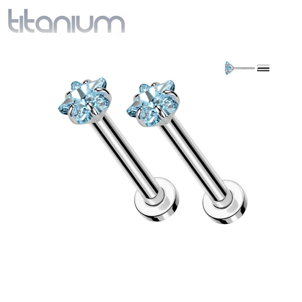 Pair of Implant Grade Titanium Small Dainty Aqua CZ Star Push In Earrings With Flat Back