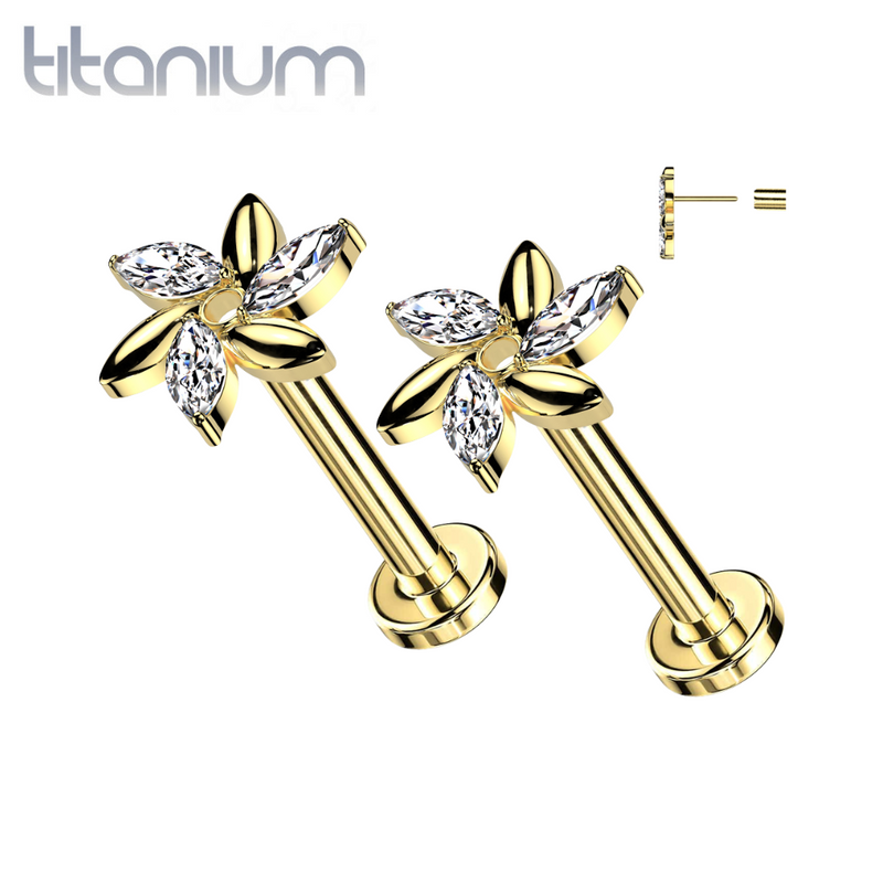 Implant Grade Titanium Gold PVD White CZ Marquise Flower Design Threadless Push In Labret - Pierced Universe