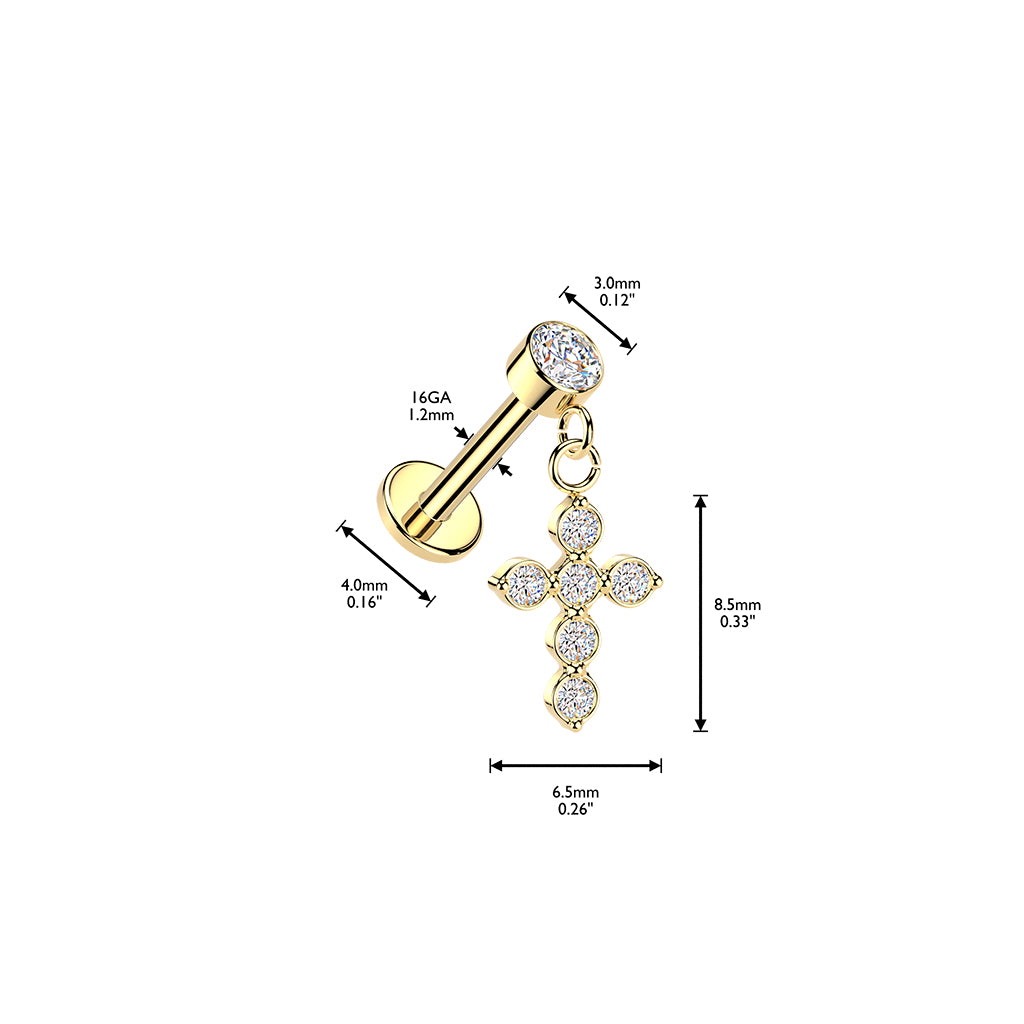 316L Surgical Steel Gold PVD White CZ Cross Dangle Internally Threaded Flat Back Labret