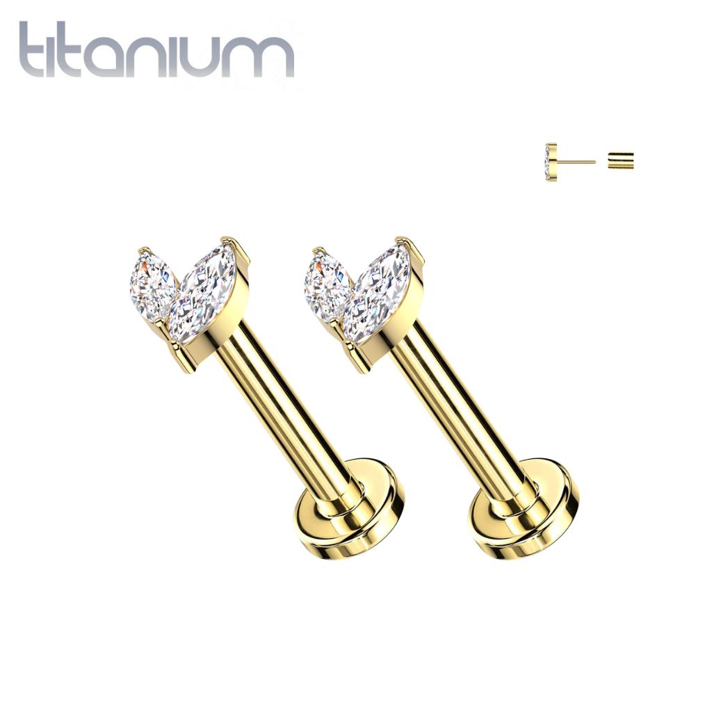 Pair of Implant Grade Titanium Gold PVD White CZ Leaf Marquise Gem Push In Threadless Earrings With Flat Back