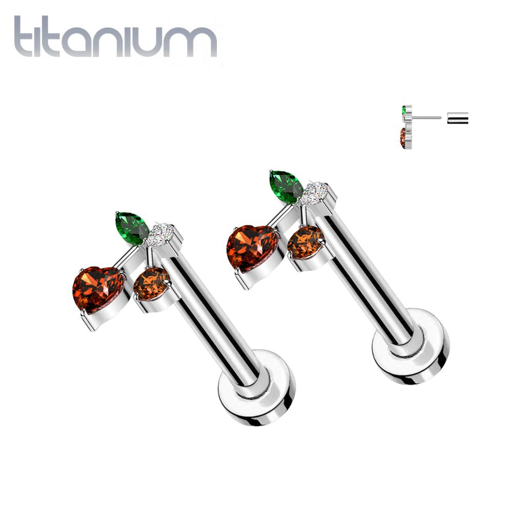 Pair of Implant Grade Titanium Red CZ Heart Cherry Cute Push In Threadless Earrings With Flat Back